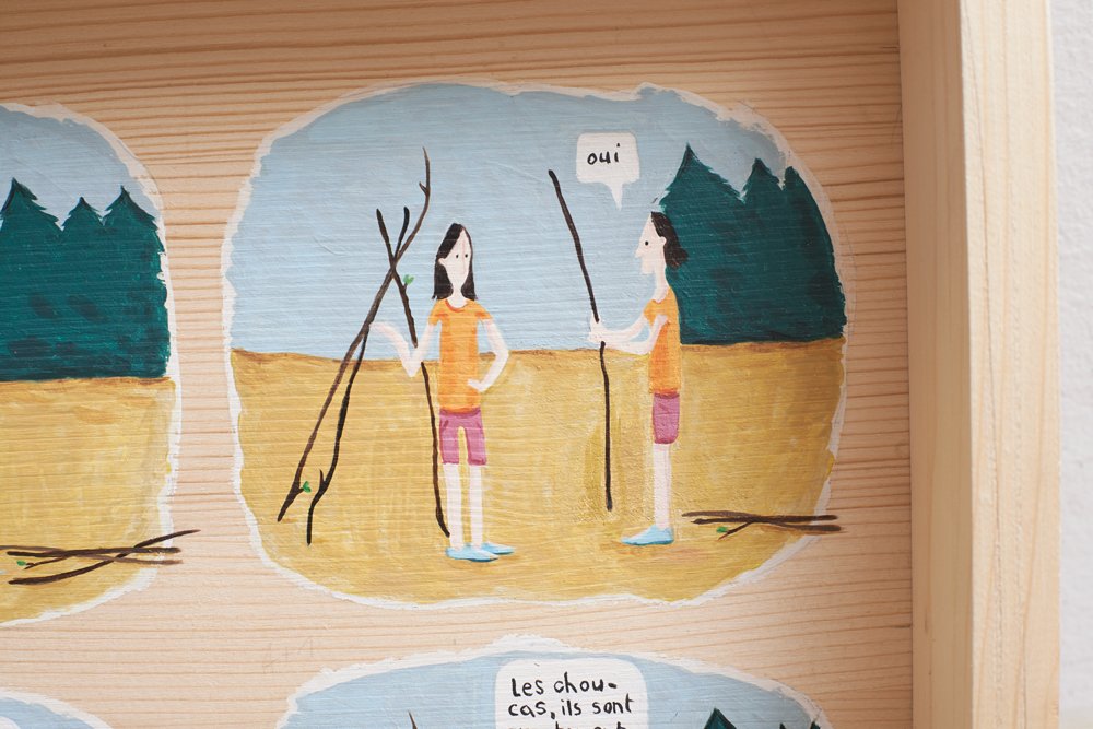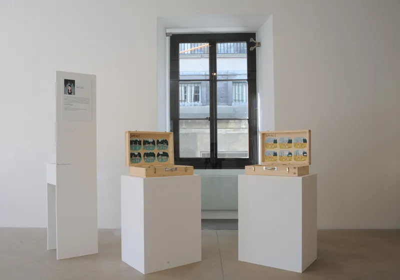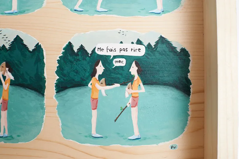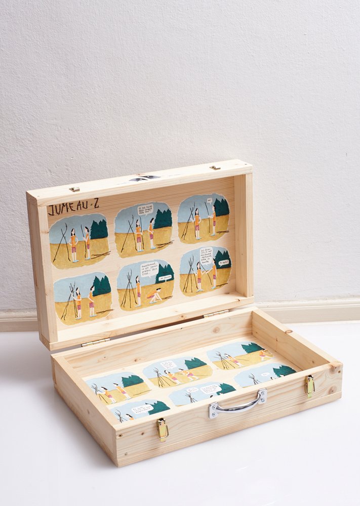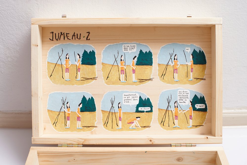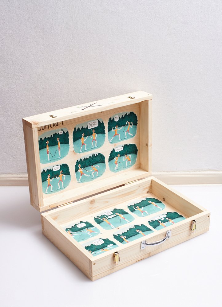 Exposition collective réalisée pour l'édition 2014 du festival de la bande dessinée lausannois BDFIL, en compagnie de 14 autres illustratrices et bédéistes suisses. Autoportrait, portrait d'une vision personnelle des hommes, BD sur un support valise. Bois et peinture acrylique. Publication sous forme de portfolio.