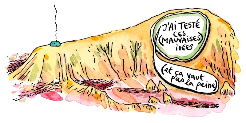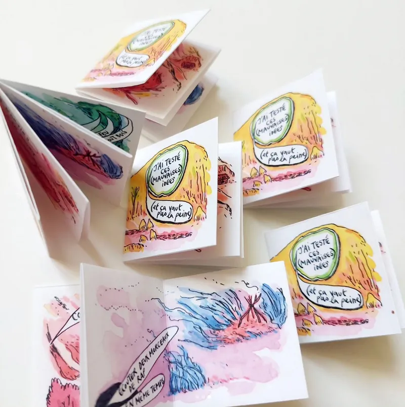 Mauvaises idées et La vraie vie. Mini-fanzines de BD publiés chez la maison d'édition nomade La déambulante créée par Marie-Aurore Conscience. Aquarelle et encre de Chine, 8 pages, format 4x4 cm. Vous pouvez les acheter auprès de La déambulante dans les divers salons de micro-édition où elle est présente durant l'année, et prochainement dans ma boutique.
