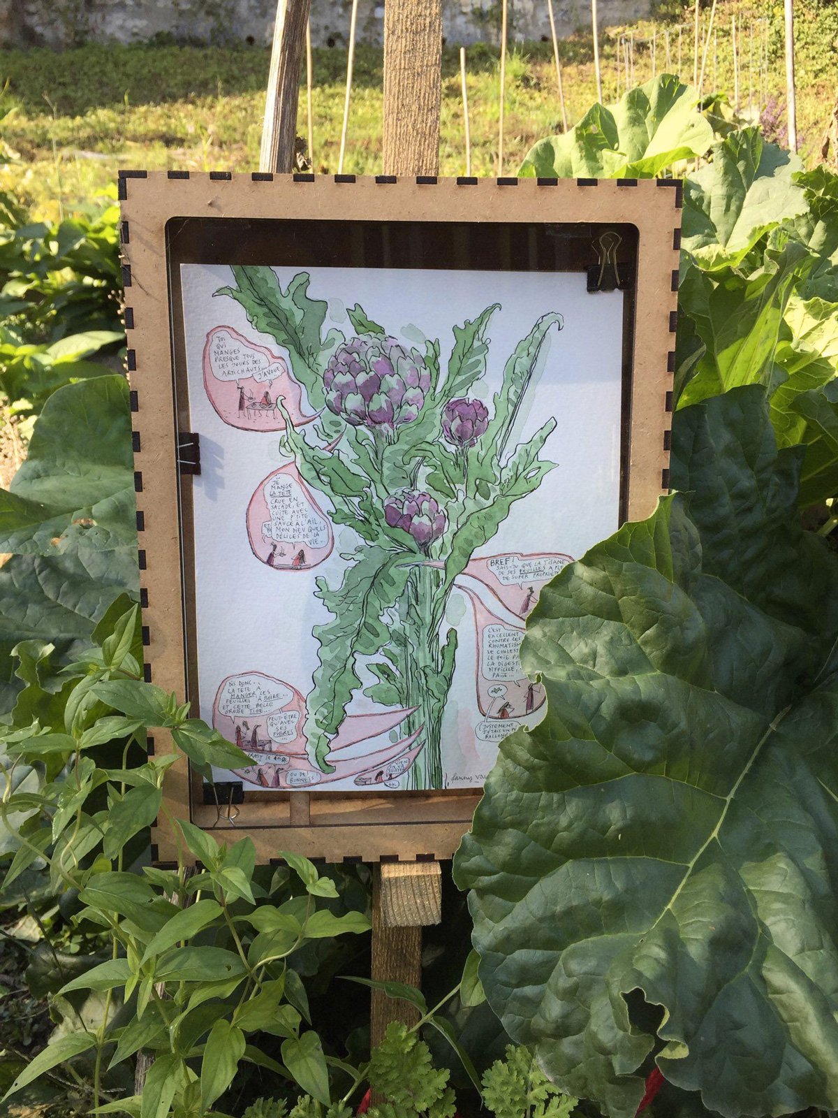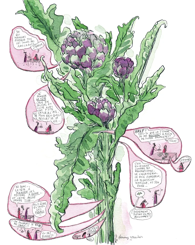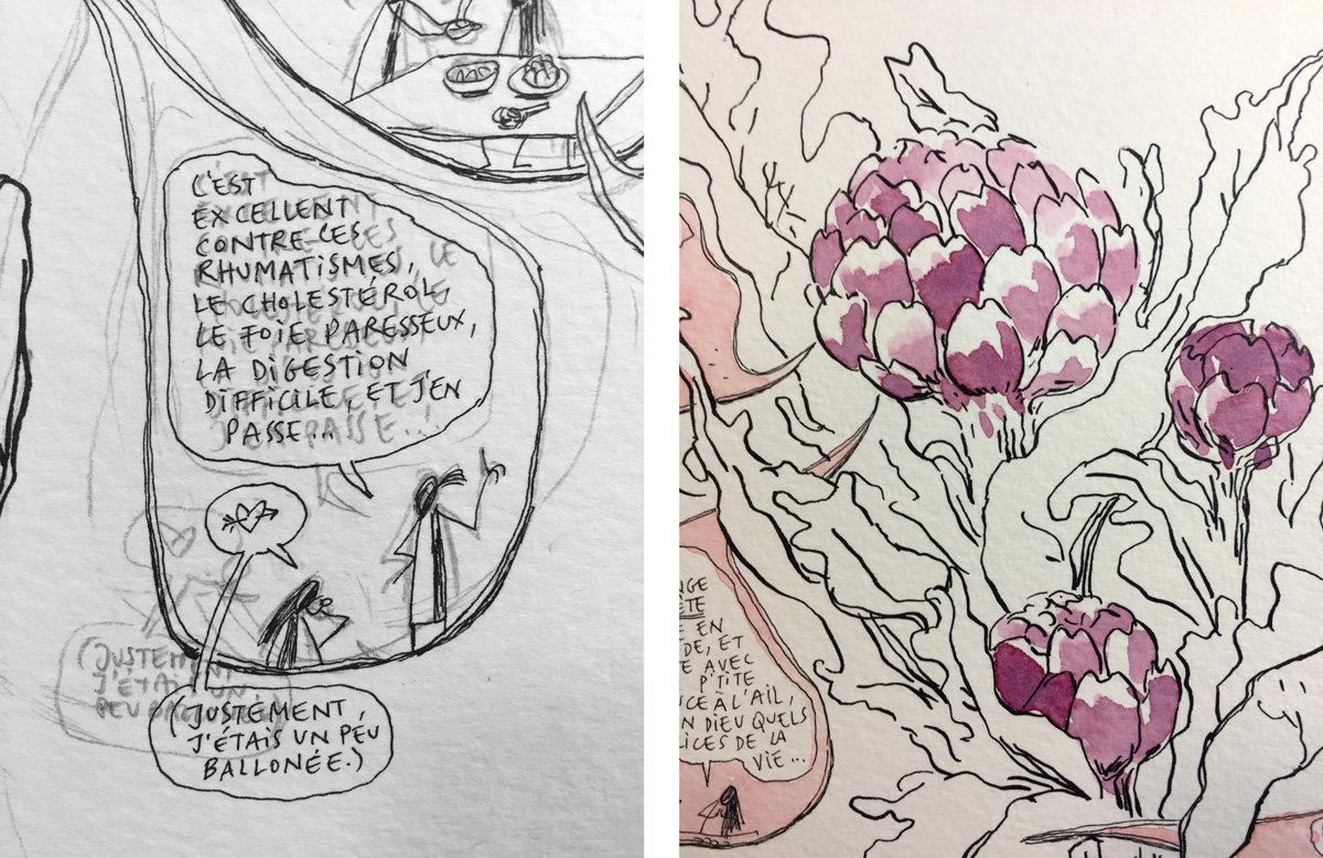 Une planche consacrée aux vertus de l'artichaut (mon légume favori), créée dans le cadre de l'exposition Oscar et la pensée sauvage, qui s'est tenue durant BDFIL 2021 au plantage du Vallon à Lausanne. Vingt-sept artistes ont visité en dessins et peintures des plantes médicinales du jardin.