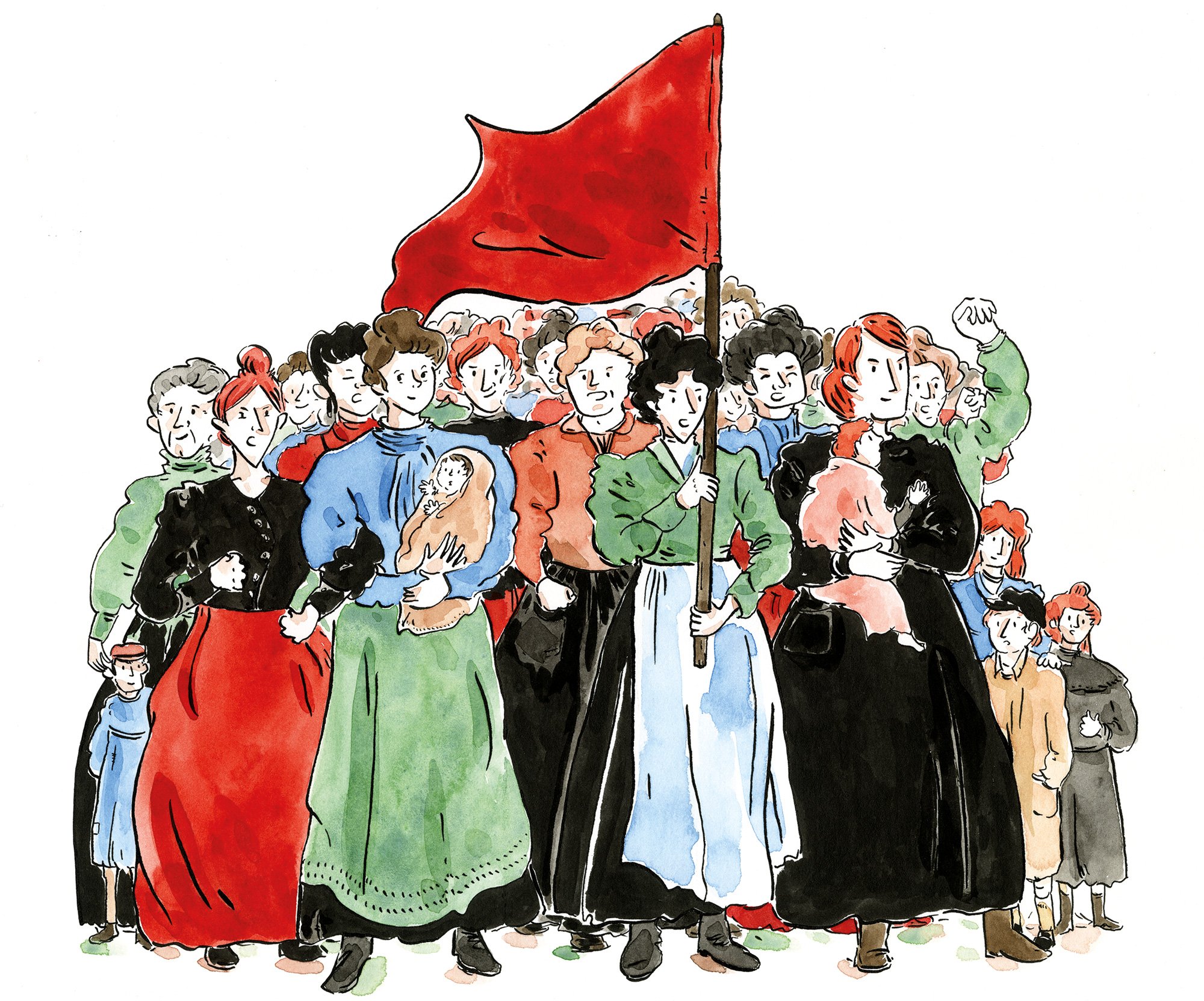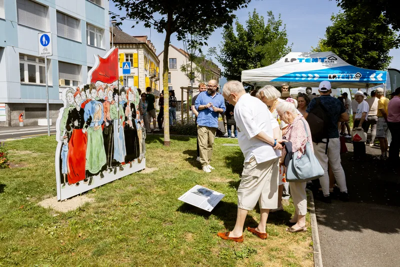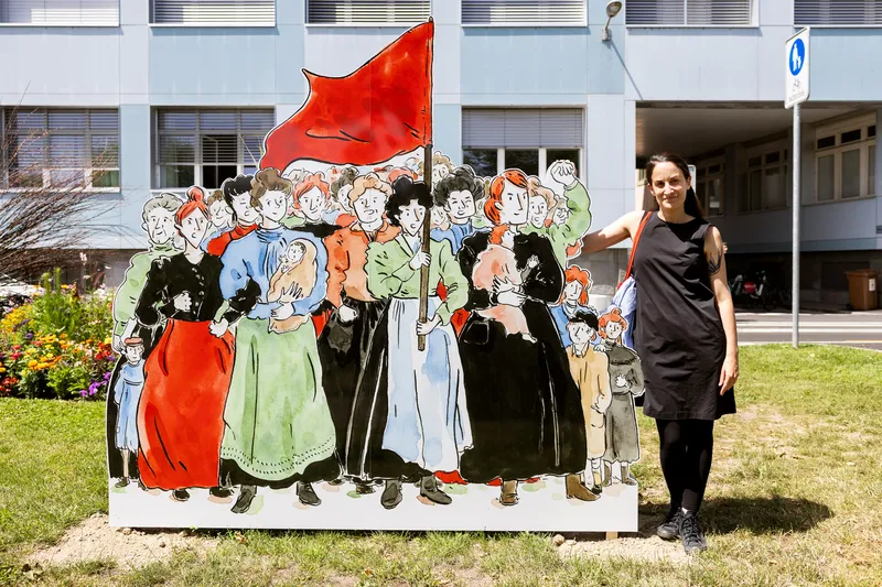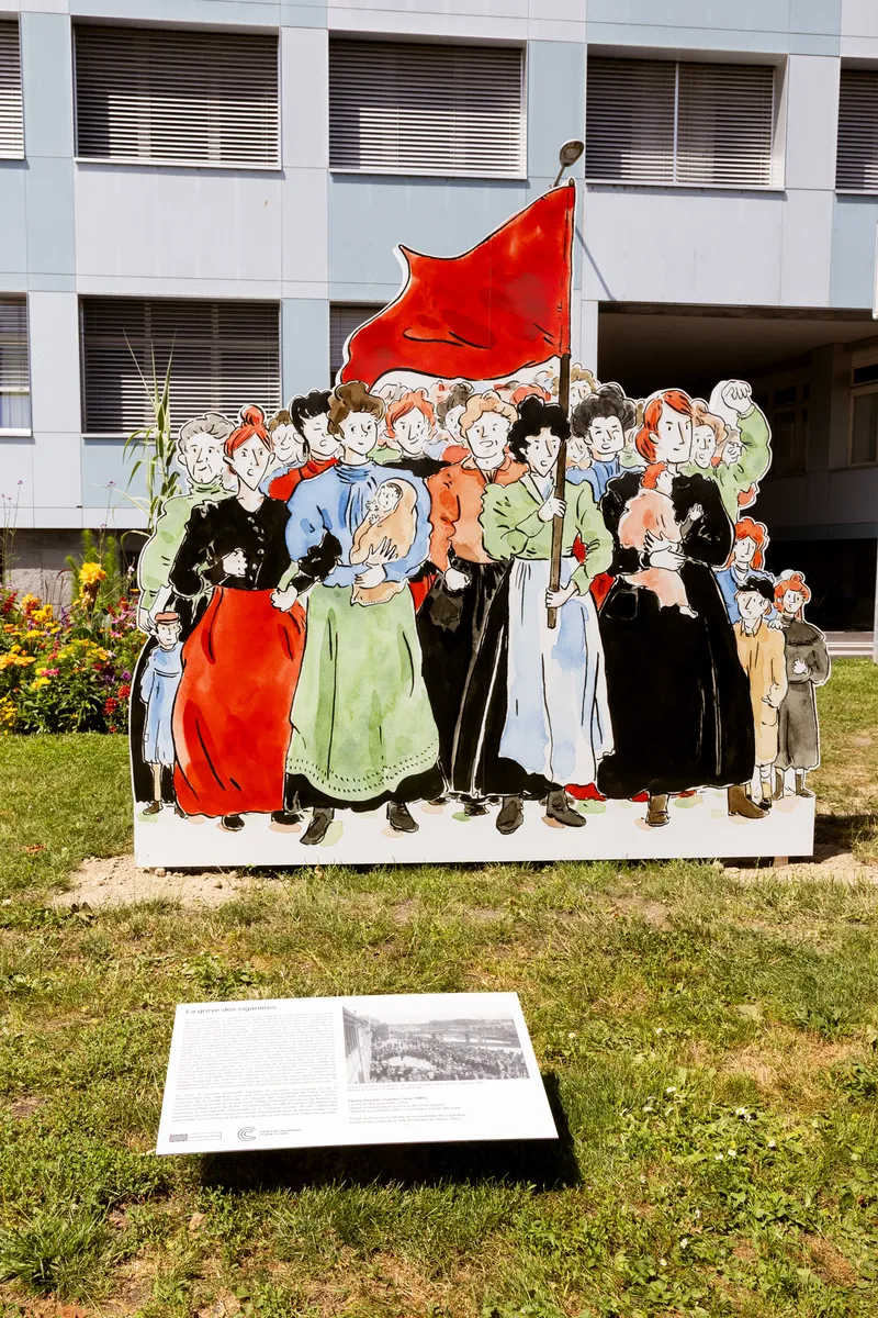 Quelle émotion! À l’emplacement exact où, en 1907, des ouvrières ont courageusement fait grève pour le droit de se syndiquer et pour des conditions de travail décentes, je les ai dessinées telles que je les imagine, pour leur rendre hommage. Parmi elles, dans la robe noire, Lucie Zingre, qui a mené cette grève avec le soutien de Margarethe Faas-Hardegger.