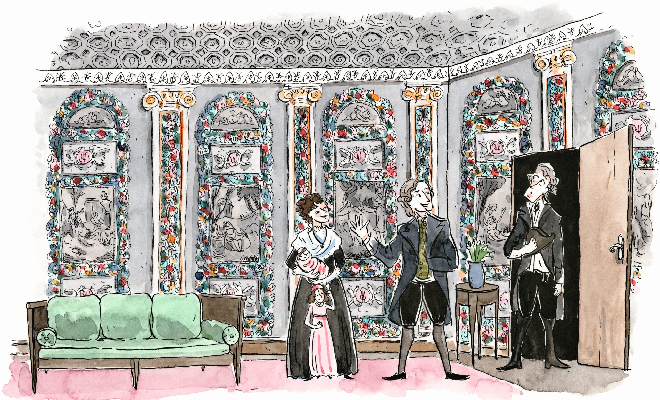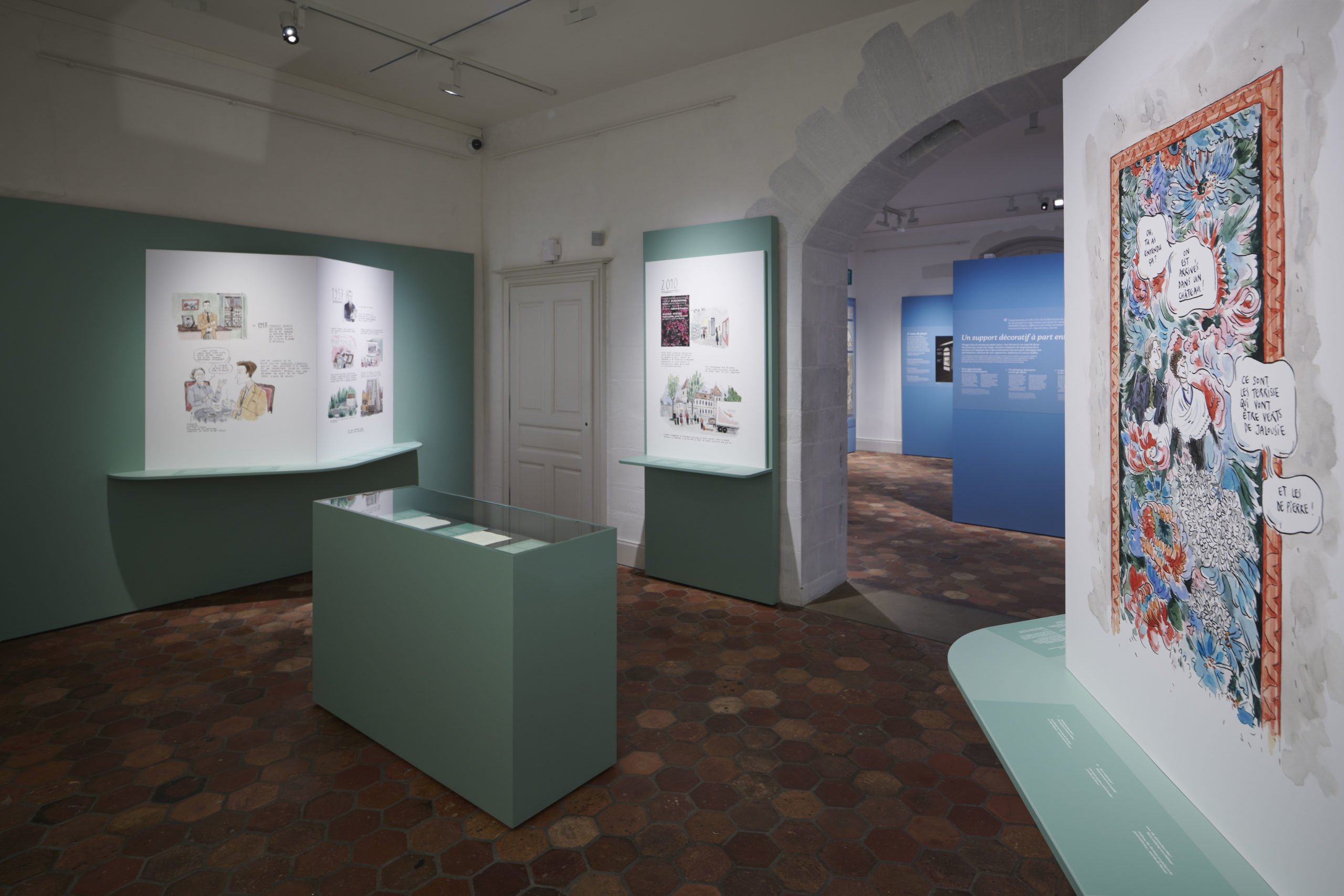 Pour raconter l’histoire rocambolesque de ce décor, j'ai créé un récit dessiné géant dans lequel il est question d’un marchand de vin, de contrebande, d’une mémorable action de sauvetage et d’un demi-siècle d’oubli dans un galetas. Ces planches constituent la première salle d'un parcours d'exposition qui débouche sur le sublime salon de papier peint lui-même.