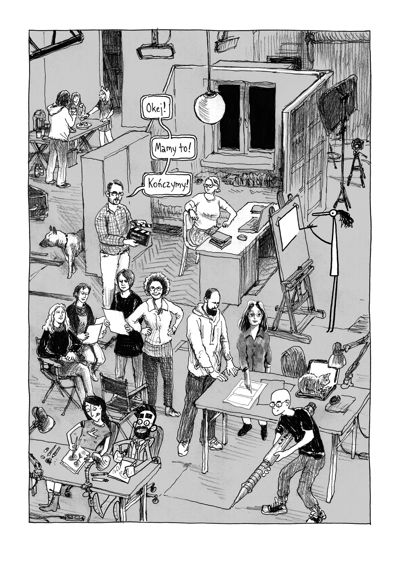 Sur la page finale, toutes les personnes ayant participé au livre se sont dessinées, et Daniel Chmielewski les a rassemblées dans un dessin unique: